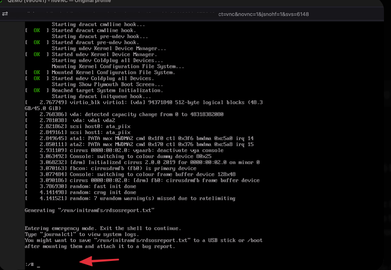 Đang vận hành hệ thống bình thường, bỗng một ngày bạn khởi động lại VPS và thấy máy chủ không lên hệ điều hành. Khi truy cập vào VNC/Console, màn hình đen ngòm hiện ra dòng chữ thông báo lỗi kẹt ở dấu nhắc lệnh :/# (chế độ Emergency Mode hoặc initramfs).