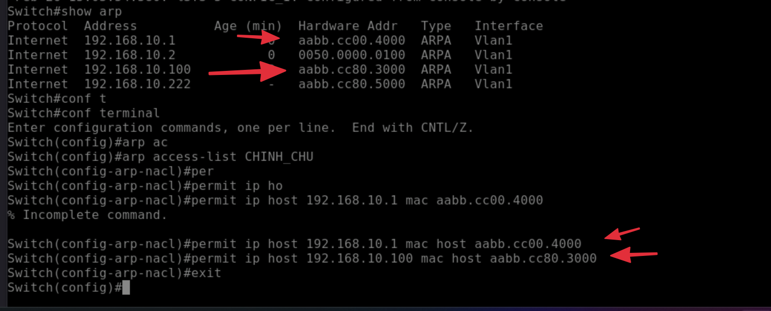 BƯỚC 1: Thu thập địa chỉ MAC chính chủ Trên con SW2, bạn gõ lệnh show arp để xem địa chỉ MAC thật của con Router (192.168.10.1) và VPC (192.168.10.100) là gì. (Ví dụ: MAC của Router là aabb.ccdd.ee01, MAC của VPC là aabb.ccdd.ee02).