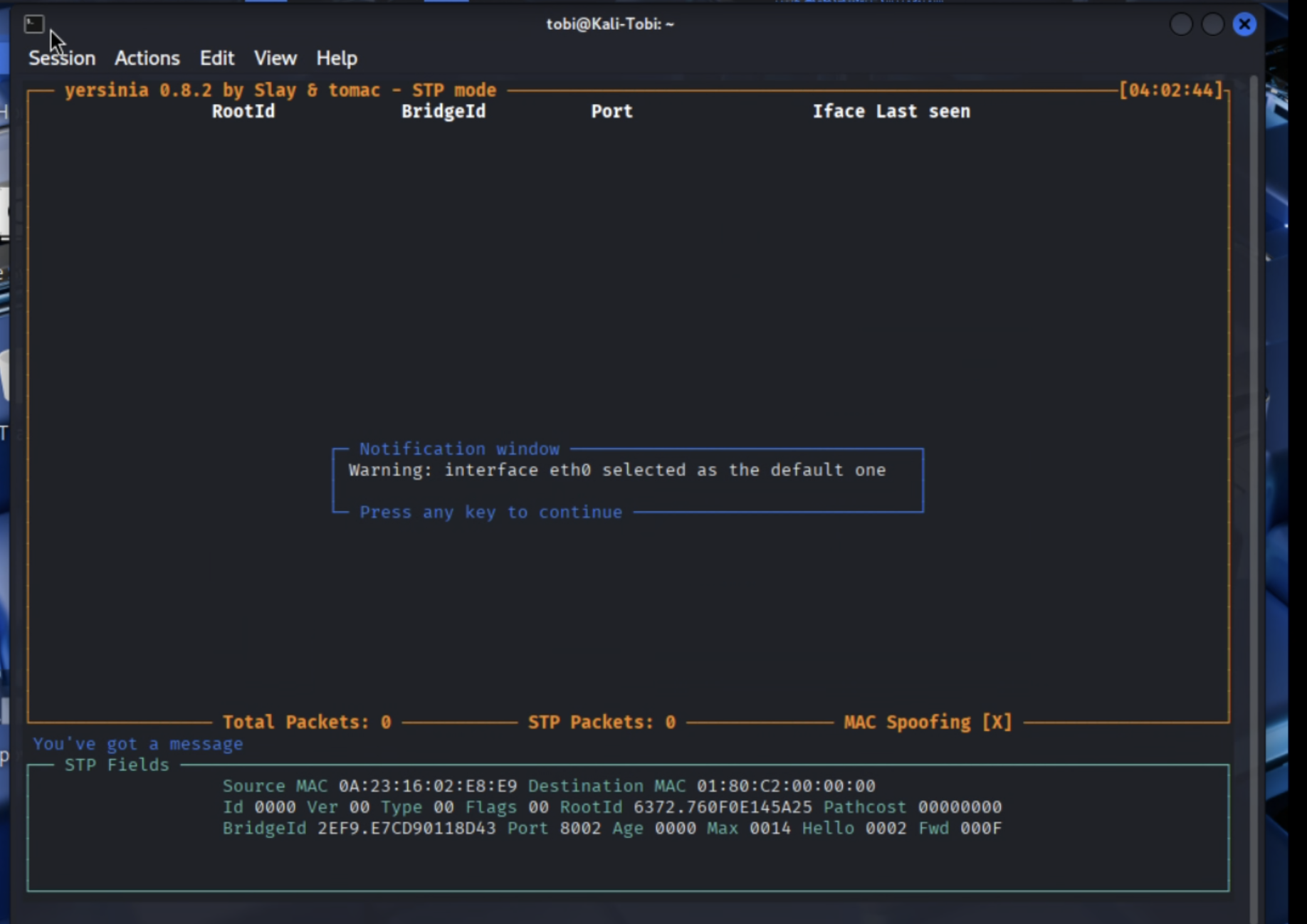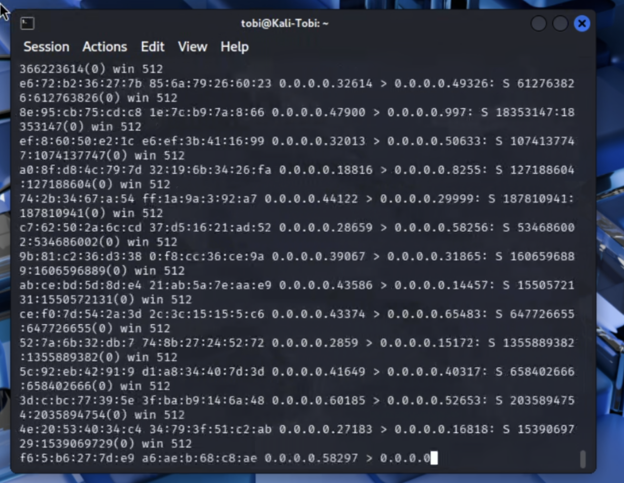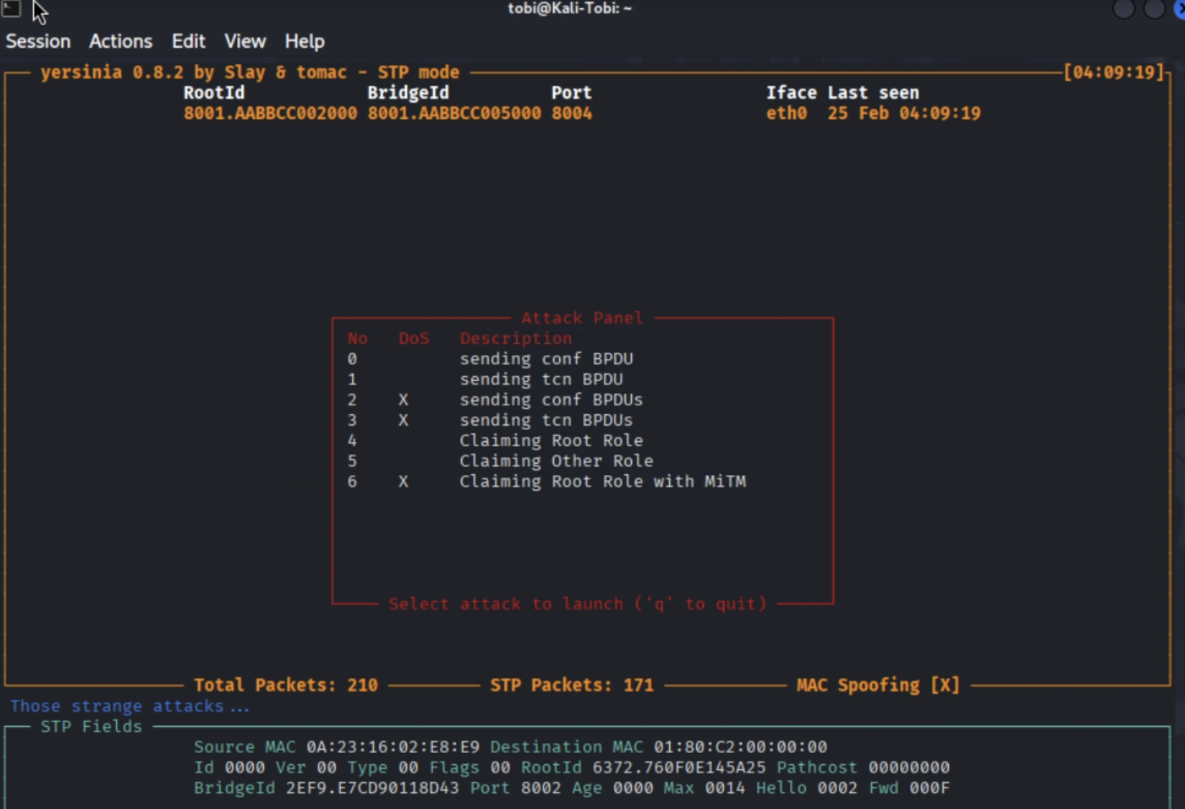 👉 Hiện tượng: Màn hình Kali sẽ cuộn chữ nhanh như ma trận. Đó là nó đang liên tục sinh ra hàng nghìn địa chỉ MAC ngẫu nhiên và tấp thẳng vào cổng của Switch!