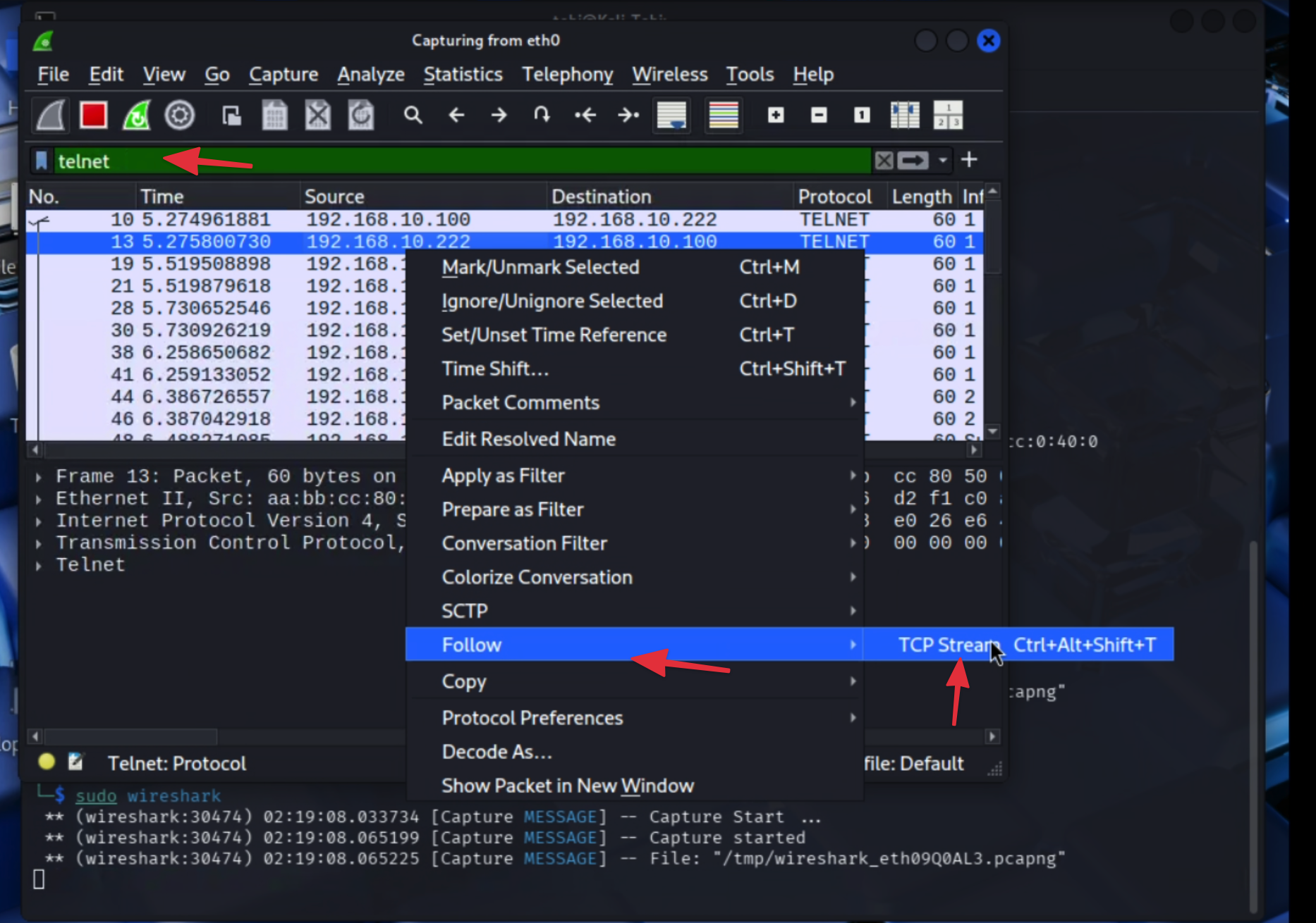 sudo wireshark, chọn cổngeth0và gõ vào thanh Filter chữ:telnet. -
