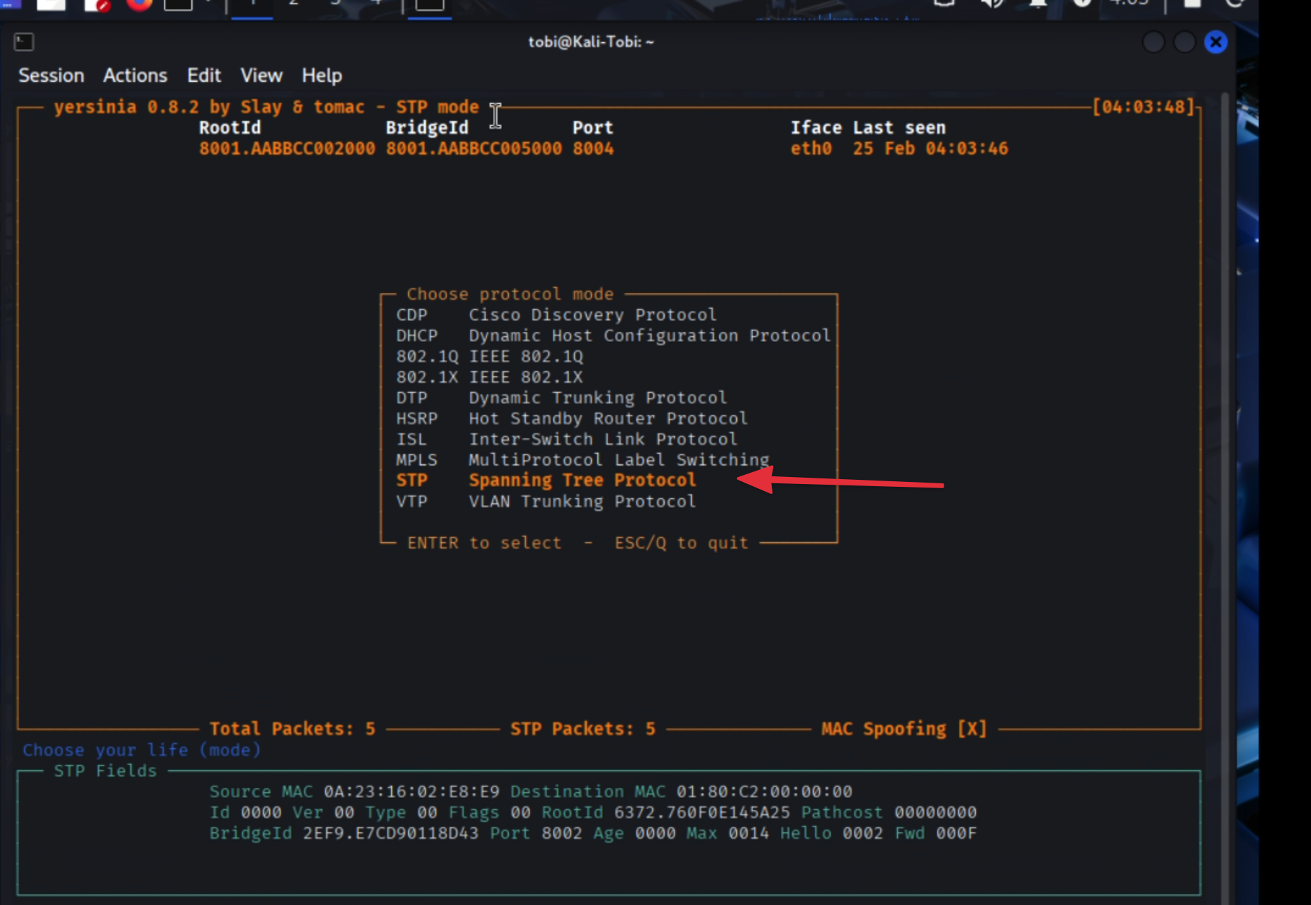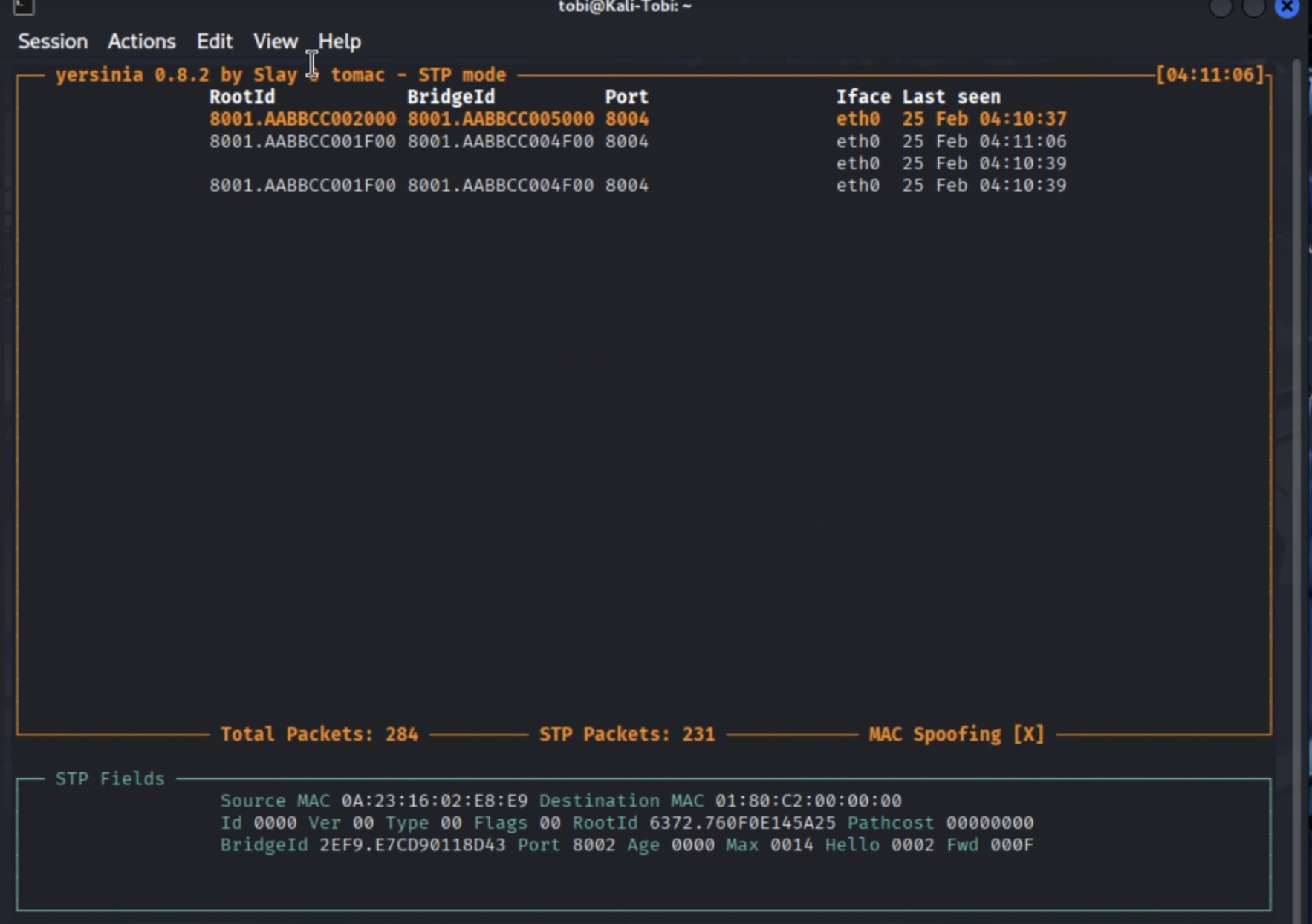 Terminal 1 (Lừa VPC): Bơm vào đầu VPC rằng MAC của Kali là MAC của SW2.
