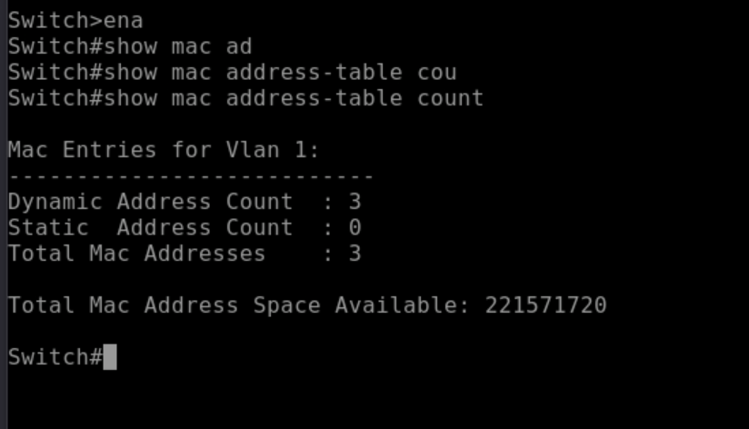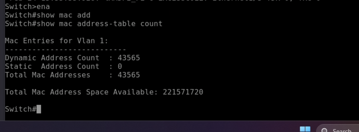 show mac address-table count👉 Kết quả: Số lượng Dynamic Address lúc này đã nhảy vọt lên con số kịch kim (thường là vài ngàn, tùy giới hạn phần cứng của Switch ảo).