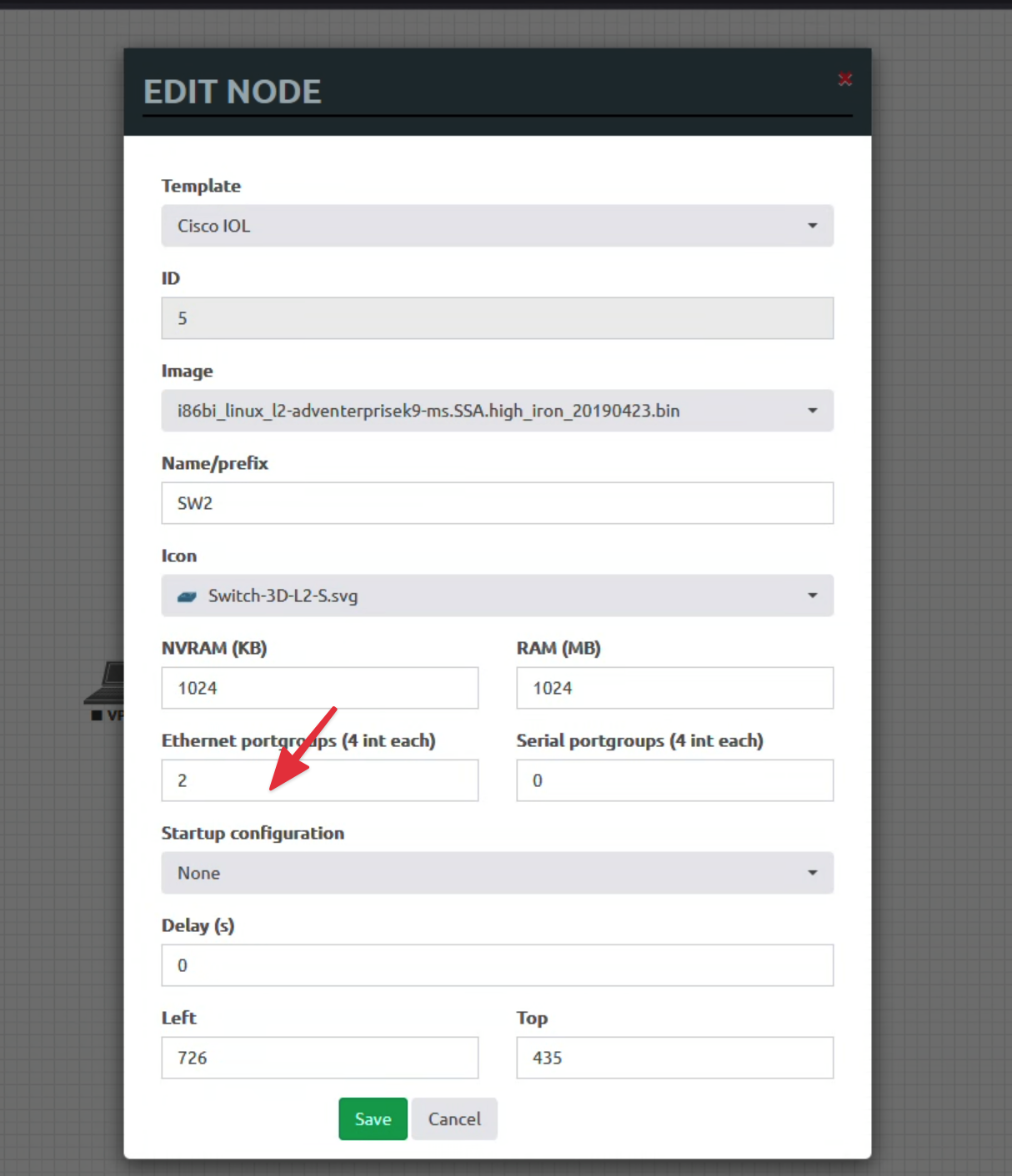Lưu ý với SW2 cần chỉnh chỗ này thành số 2 thì mới có cổng e1/0 nhé :