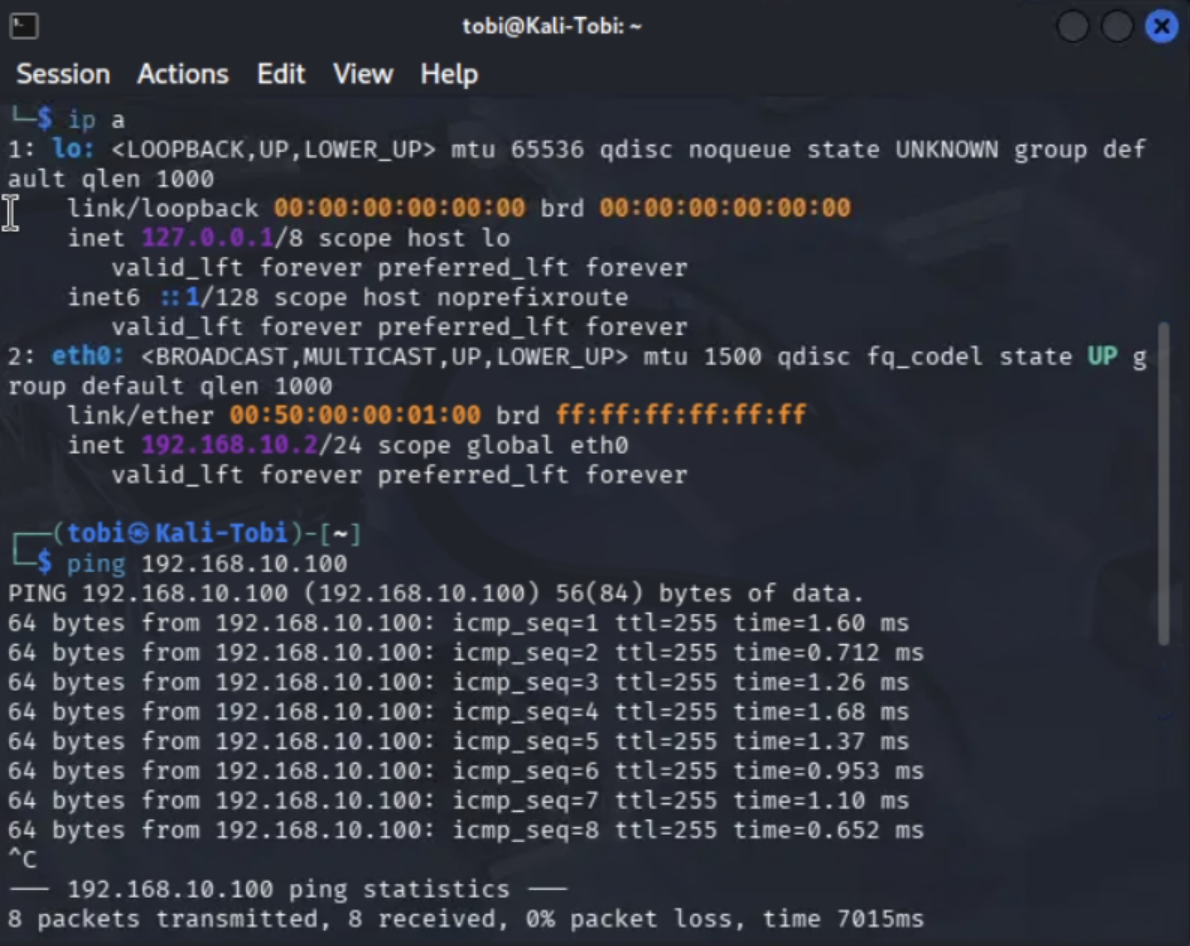 ping 192.168.10.100(xem có thấy máy nạn nhân không).