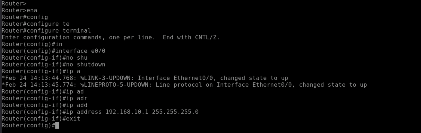 Bạn mở Console của Router, gõ các lệnh sau để bật cổng và gán IP 192.168.10.1: