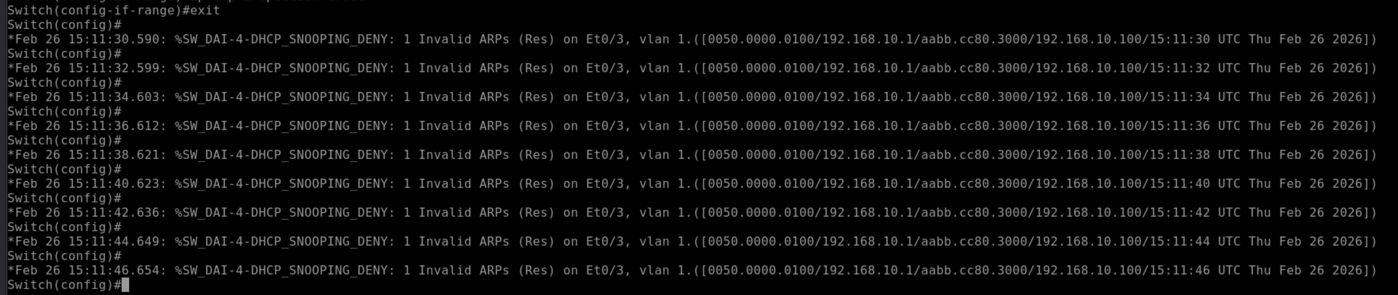%SW_DAI-4-ACL_DENY: 1 Invalid ARPs (Req) on Et0/3, vlan 1.([MAC_KALI]/192.168.10.1/...)(Dòng log này báo cáo: Cổng