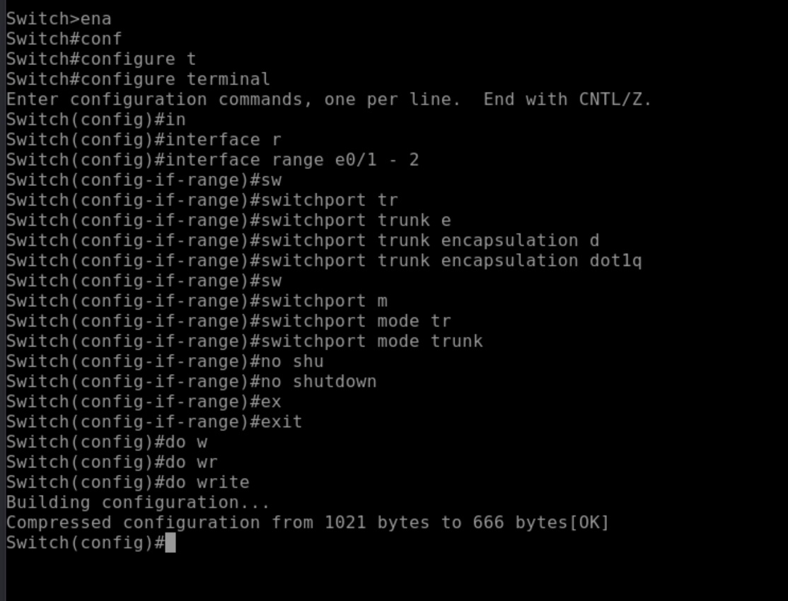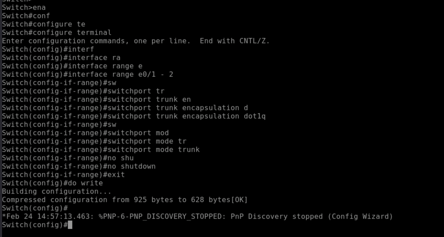 Mặc định thì các Switch khi bật lên đã thông nhau ở VLAN 1 rồi. Tuy nhiên, để chuẩn bị nền tảng cho bài STP và VLAN Hopping lát nữa, chúng ta cần ép 2 sợi cáp nối giữa 2 Switch (cổng e0/1 và e0/2) thành đường Trunk.