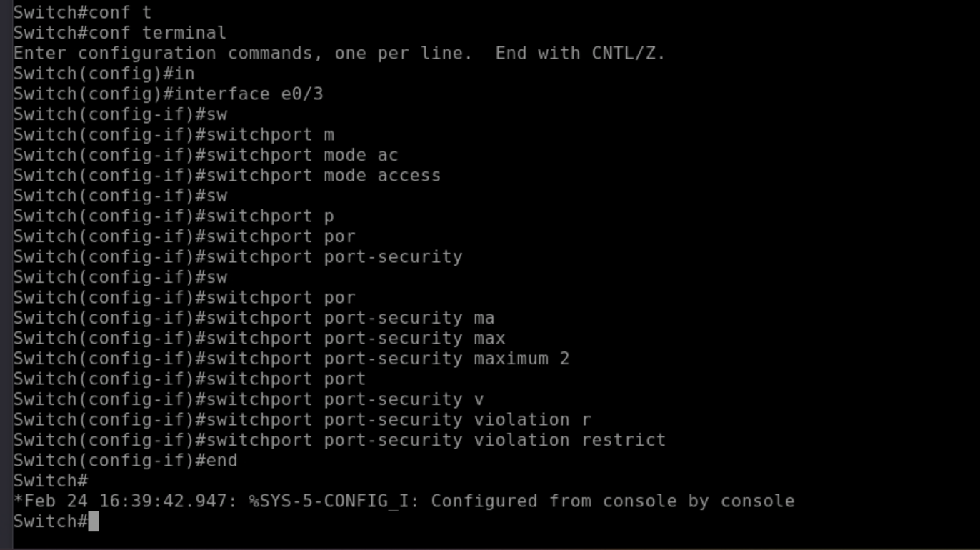 (💡 Giải thích: Chế độ violation restrict sẽ thẳng tay vứt bỏ các gói tin chứa MAC giả và cảnh báo, nhưng vẫn giữ cổng hoạt động. Nếu bạn đổi thành violation shutdown, cổng sẽ bị tắt đen thui ngay lập tức).