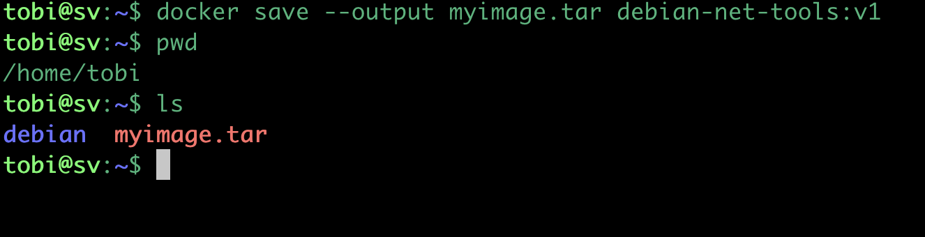 #lưu ra file, có thể chỉ ra đường dẫn đầy đủ nơi lưu file docker save --output myimage.tar myimage
