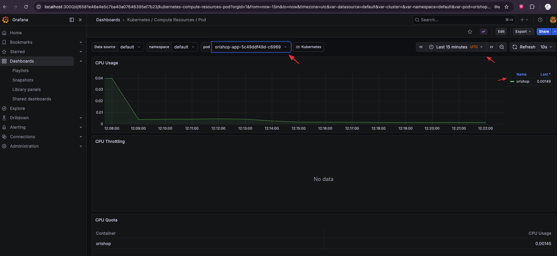 Trong Grafana, hãy tìm Dashboard: "Kubernetes / Compute Resources / Pod". Tại đây, bạn sẽ thấy toàn bộ "nhịp tim" của ứng dụng: từ mức độ ngốn CPU cho đến dung lượng RAM thực tế mà các Pod đang sử dụng.