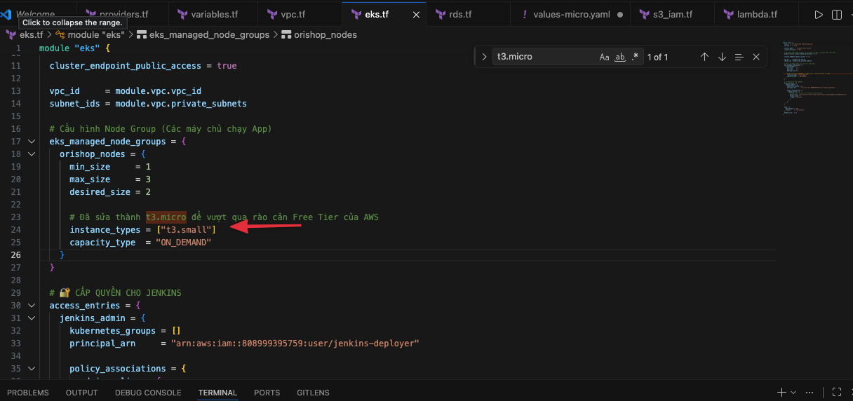 instance_types = ["t3.micro"]thànhinstance_types = ["t3.medium"]. (Nhưng với chế độ con nhà nghèo của mình thì mình chỉ dùng t3.small thôi nhé ) -
