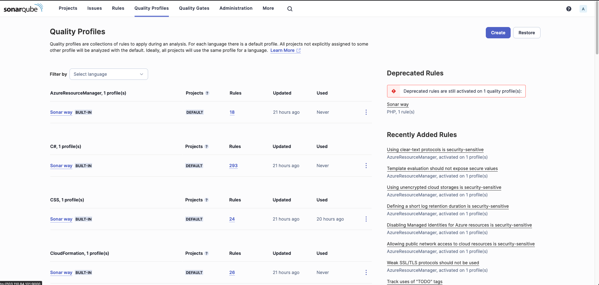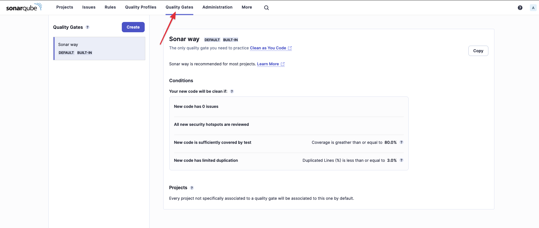 Hiện tại dự án của tôi đang dùng cổng kiểm duyệt mặc định (gọi là Sonar way). Cổng này khá hiền, chỉ bắt lỗi trên những dòng code mới viết.