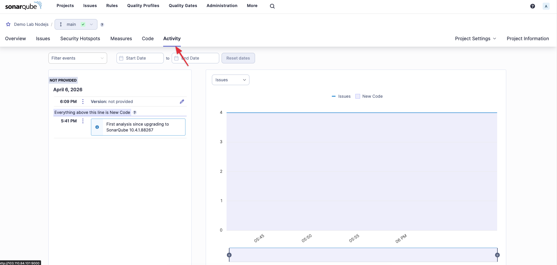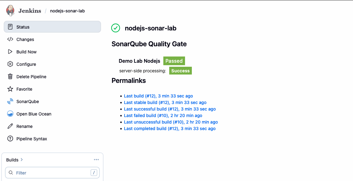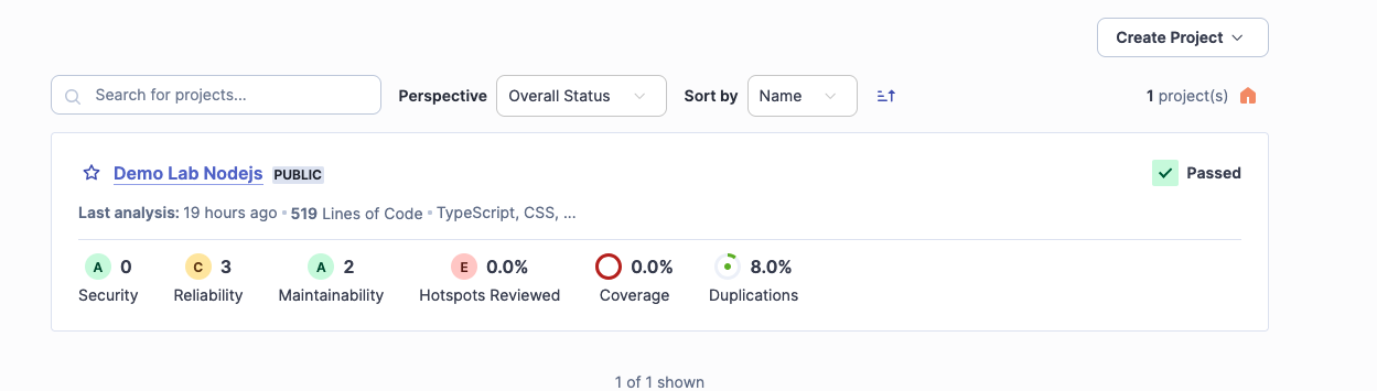 Bây giờ, "đường ống" đã được lấp kín và trơn tru. Khi vào giao diện SonarQube, dự án Demo Lab Nodejs của bạn đã hiển thị xanh mướt.