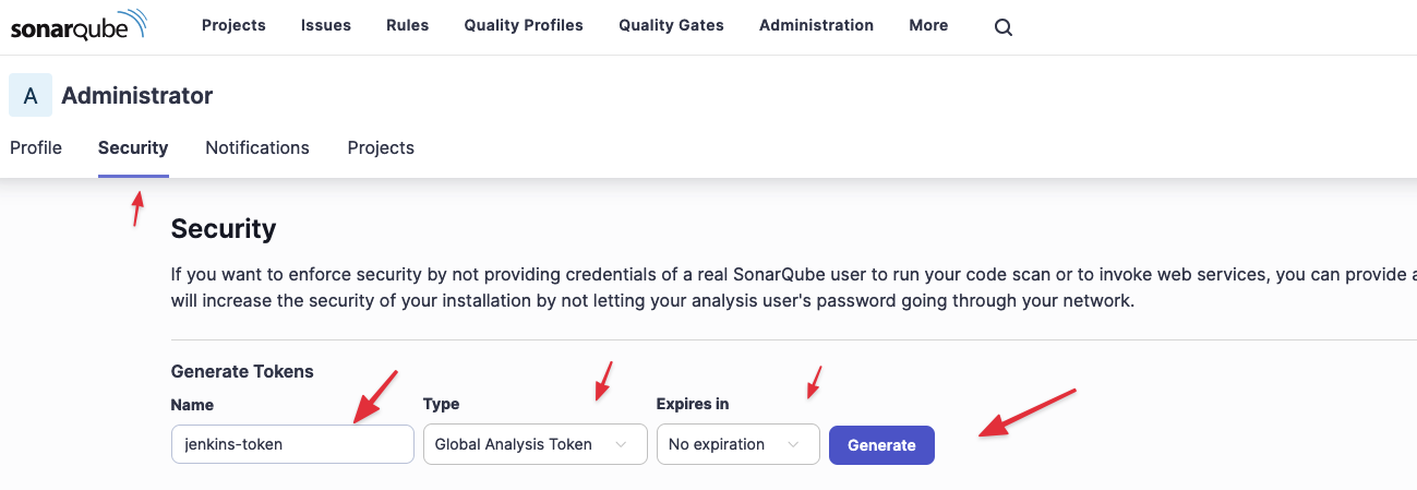 Để Jenkins có quyền gửi dữ liệu sang, nó cần một mã xác thực (Token) từ SonarQube.