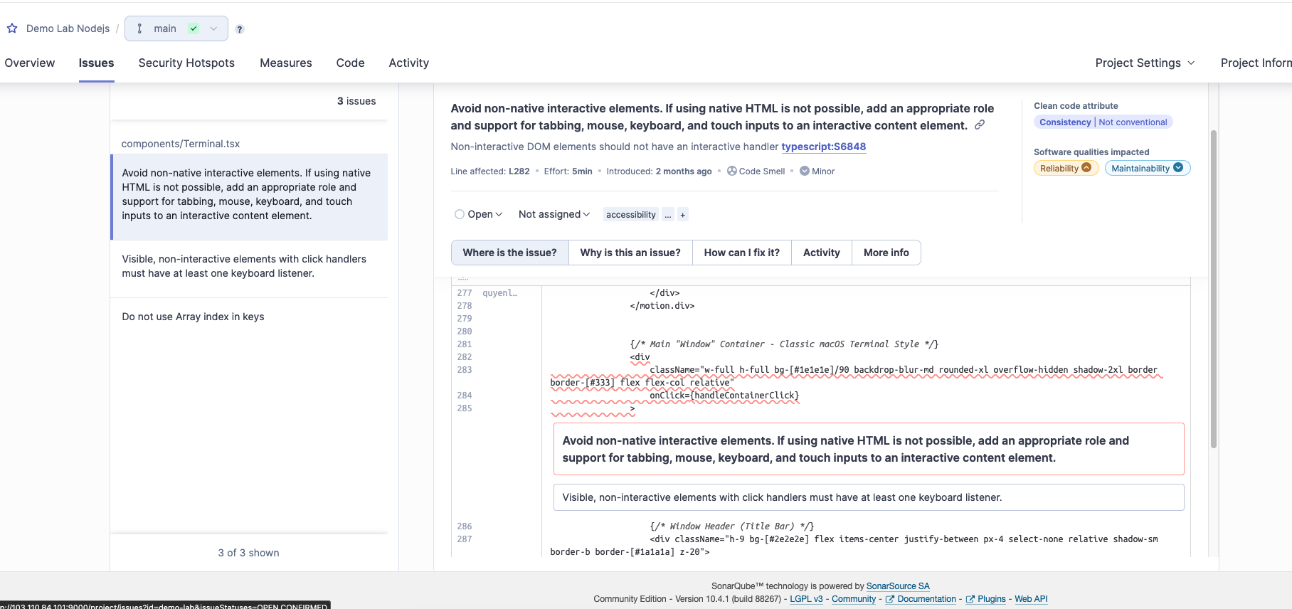 SonarQube đã tóm gọn được một vi phạm về Accessibility (a11y - Khả năng truy cập). Bức ảnh cho thấy SonarQube đang "kẹp cổ" cái thẻ <div> ở dòng 282 và nã cho 2 tội danh liên tiếp.