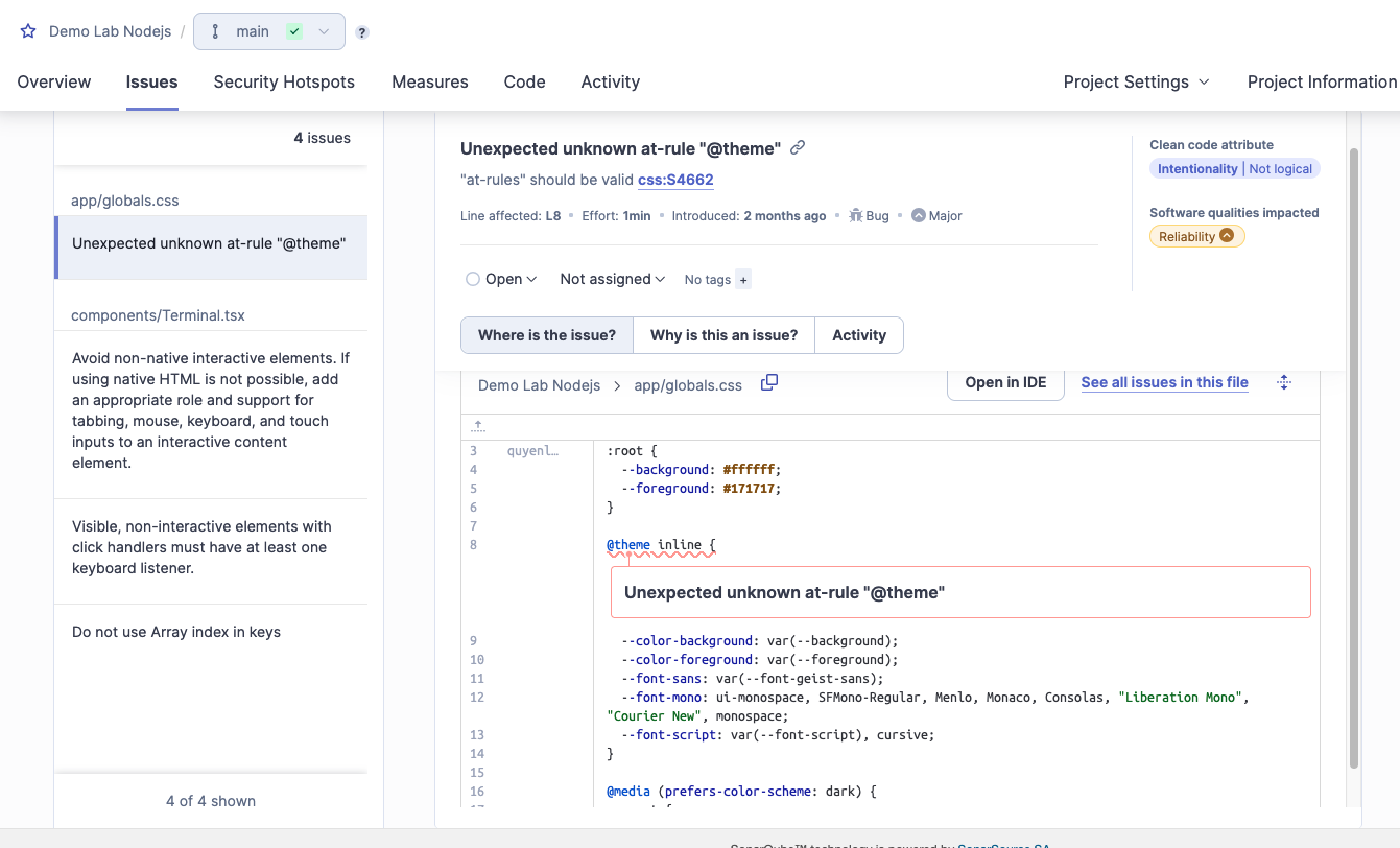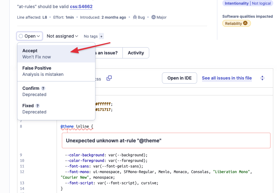 Nhớ pha SonarQube "báo oan" cú pháp @theme của Tailwind CSS không? Nếu mỗi file CSS nó đều báo lỗi thì boss click Resolve as False Positive gãy tay mất.