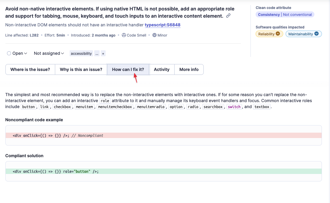 Nếu bạn click sang tab "How can I fix it?" trên giao diện, SonarQube cũng sẽ gợi ý cho bạn 2 con đường này:
