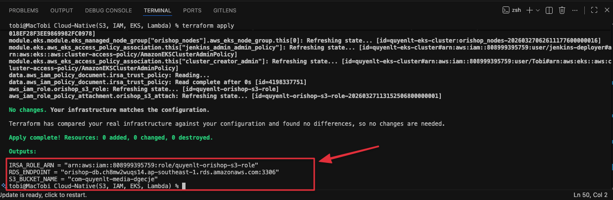 Vì lệnh apply lúc nãy của bạn chắc đã tạo xong (hoặc gần xong) EKS rồi. Tobi chỉ cần mở Terminal lên và gõ lại lần nữa: