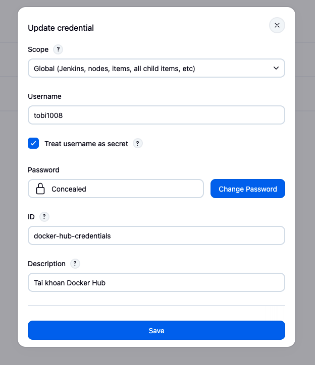 Bước 2: Cấp chìa khóa kho Docker Hub Tương tự, Jenkins cần mật khẩu để đẩy Image lên kho tobi1008. Bạn cũng vào Credentials của Jenkins và lưu Username/Password của Docker Hub vào đó nhé.