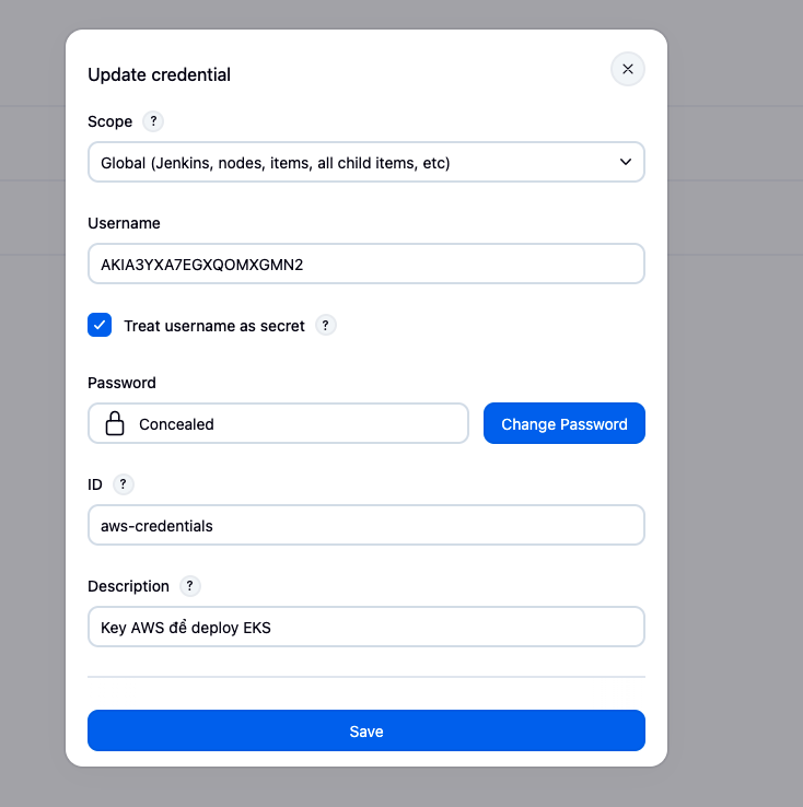 Vào giao diện web của Jenkins -> Manage Jenkins -> Credentials -> Thêm cặp khóa này vào dưới dạng Secret text hoặc Username with password để lát nữa Pipeline lấy ra dùng.