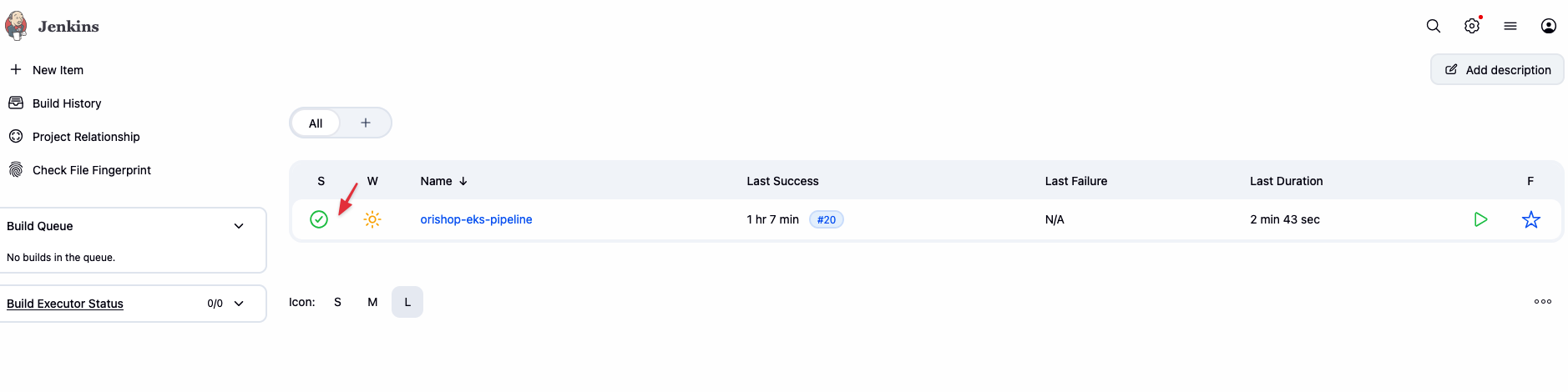 quay lại giao diện Jenkins trên trình duyệt, vào project orishop-eks-pipeline và thực hiện cú búng tay quyết định: