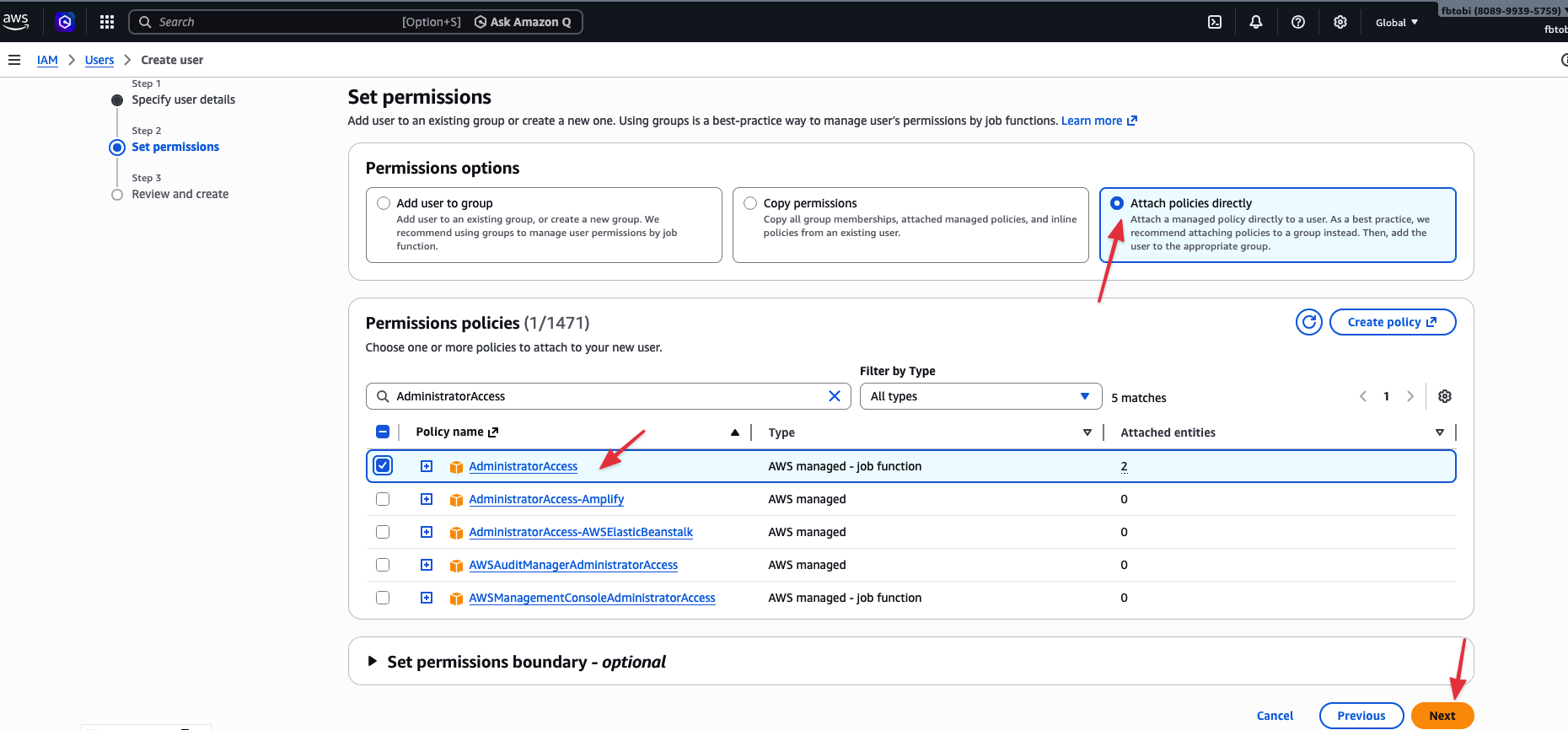 - Đăng nhập AWS Console, vào IAM -> Tạo một User tên là