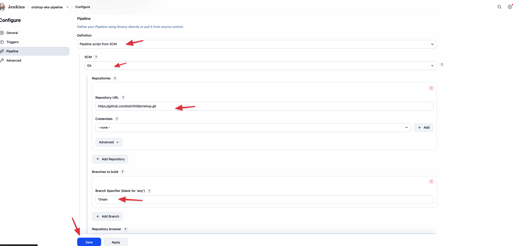 Jenkinsfile: Viết các Stage rõ ràng: Checkout Code -> Build bằng Maven (tạo file .jar) -> Build Docker Image -> Push Image lên Docker Hubtobi1008/orishop:latest(hoặc build ID) -> Chạy lệnhkubectl applyvàkubectl rollout restartđể ép EKS cập nhật bản mới. -