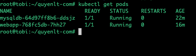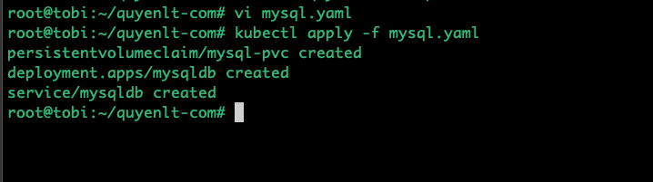 Đầu tiên, bạn cần lấy tên chính xác của Pod MySQL đang chạy (nó sẽ có dạng mysqldb-xxxxxxxx-yyyy). Bạn lấy tên đó ở lệnh kubectl get pods vừa gõ xong.