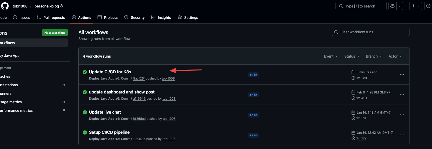 Bạn hãy sửa file, commit và push lên GitHub để kích hoạt đường ống CI/CD này chạy thử xem sao nhé. Cứ mở tab Actions trên GitHub theo dõi, nếu nó báo "tick xanh" thành công thì báo lại cho tôi, chúng ta sẽ test thử một thay đổi nhỏ trên web!