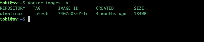 Giờ thì hệ thống sẽ có thêm image với tên almalinux, có thể góc lại lệnh kiểm tra docker images -a ở trên để xem.