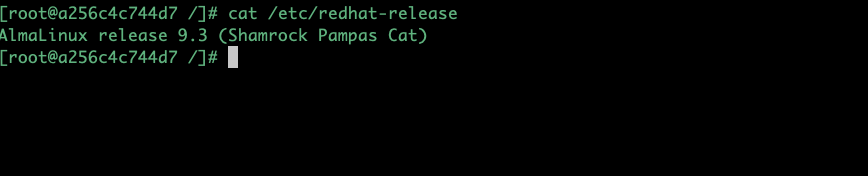 Sau lệnh này, bạn đang chạy Almalinux, bạn có thể gõ vài lệnh Almalinux kiểm tra xem. Ví dụ kiểm tra phiên bản Almalinux, xem hình dưới với lệnh cat /ect/redhat-release. Như vậy bạn đã tạo một container