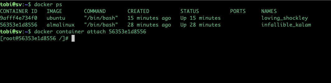 Bạn chú ý có tham số -it để khi container chạy, bạn có terminate làm việc ngay với Almalinux. Tham số này có nghĩa là