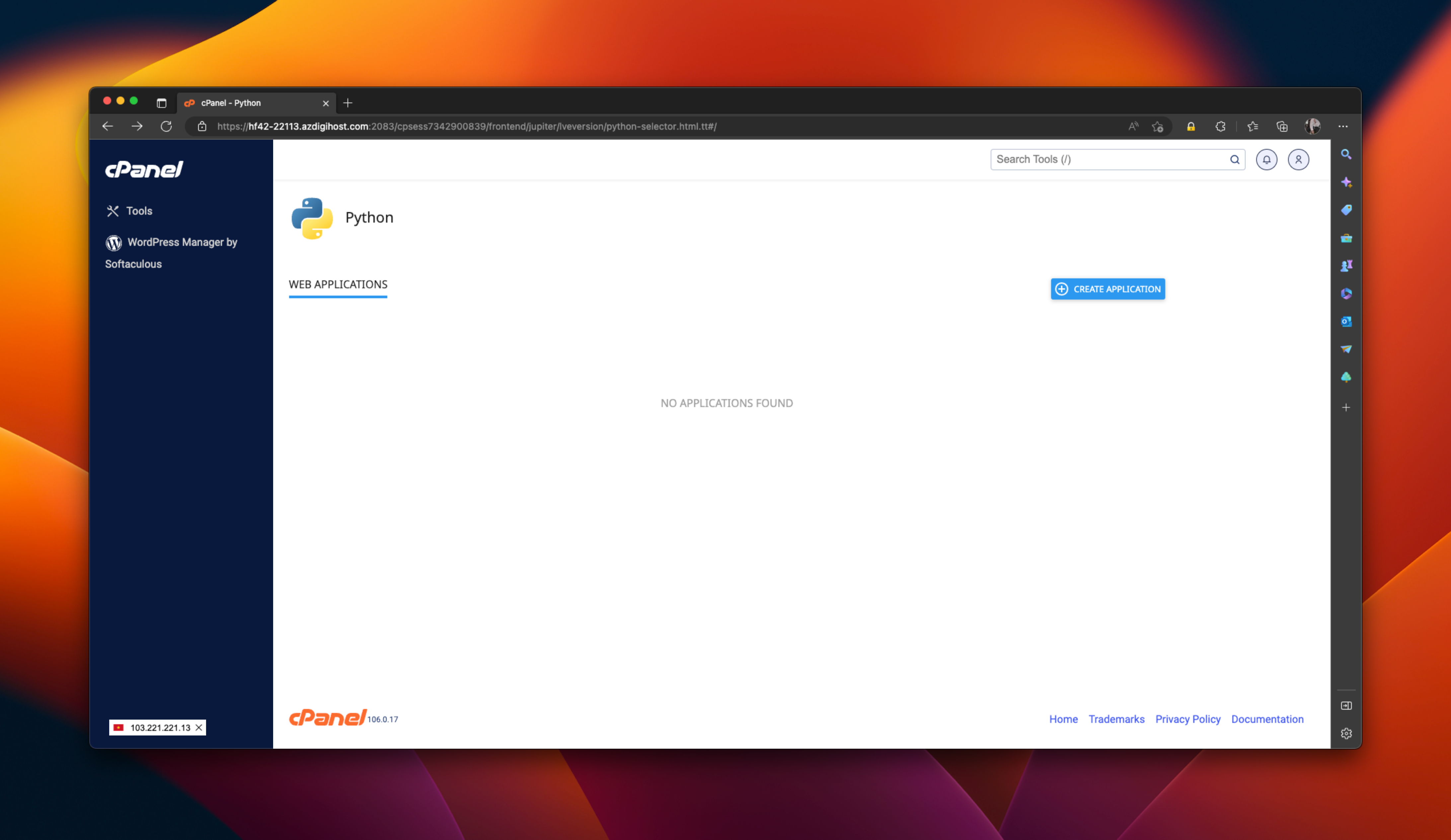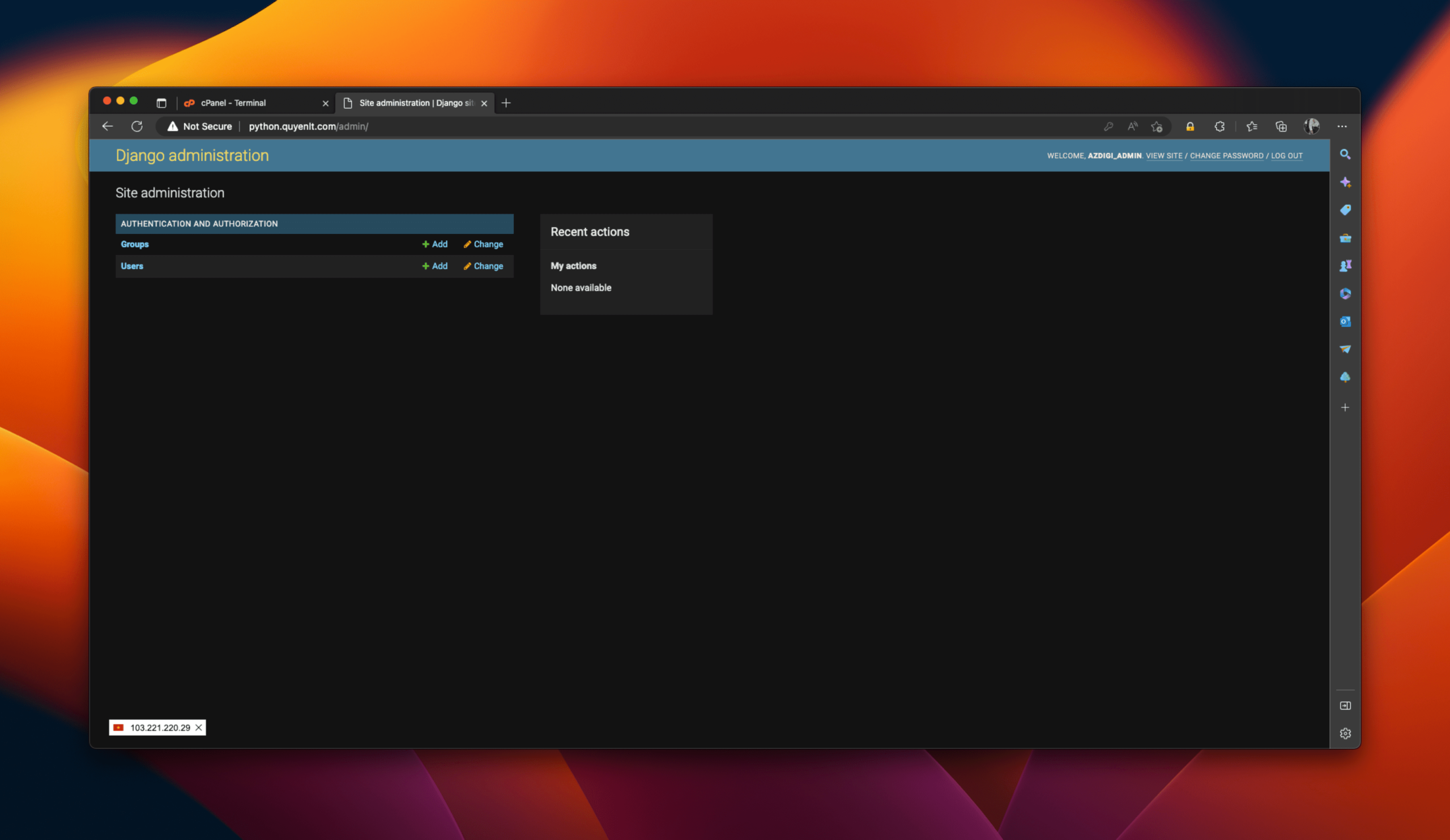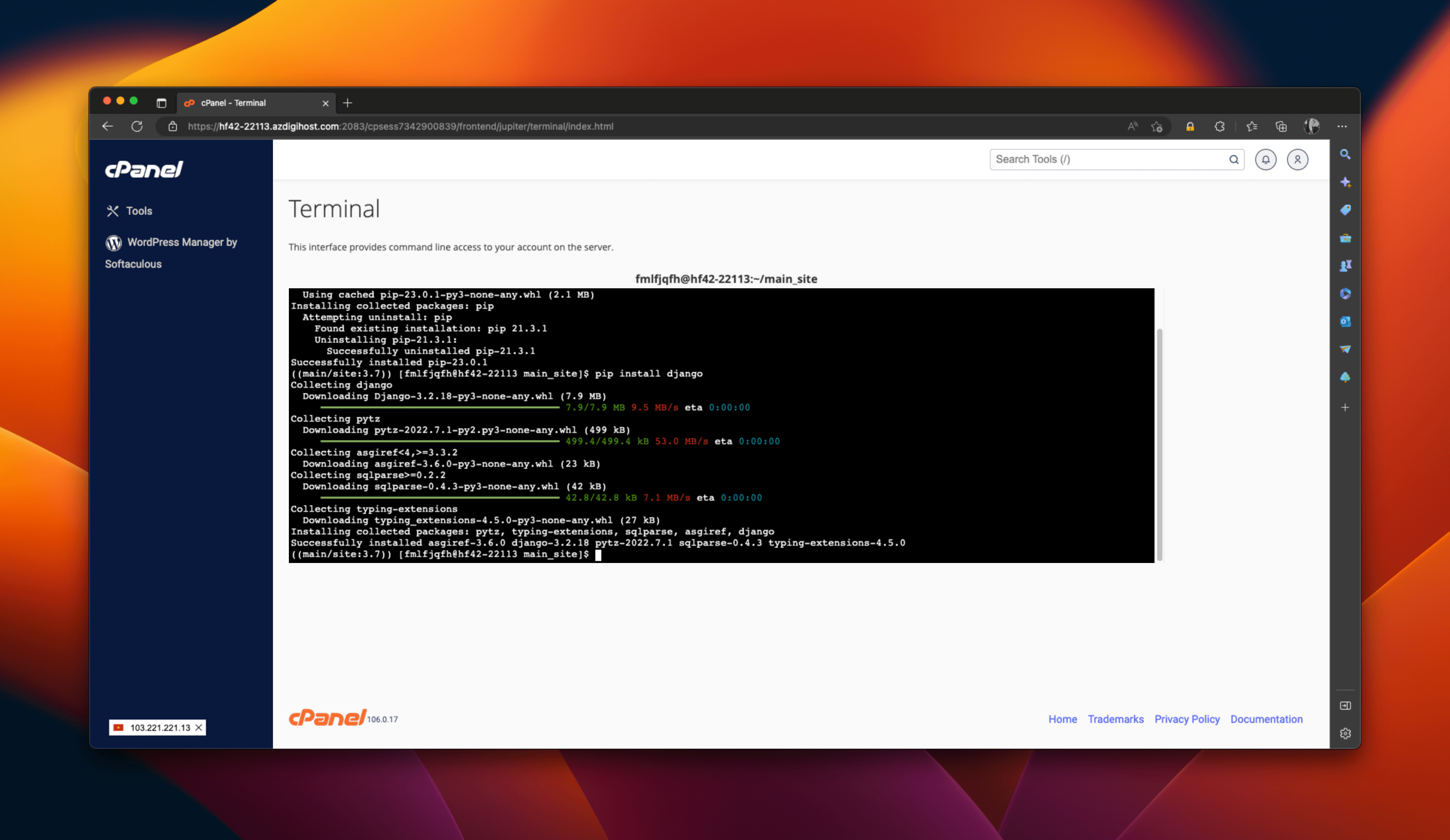 - Khi đã tạo được ứng dụng Python, chúng ta sẽ cài đặt Django bằng cách sử dụng Terminal. Chúng ta sẽ truy cập vào Terminal thông qua trang quản trị của cPanel và chạy lệnh sau:
