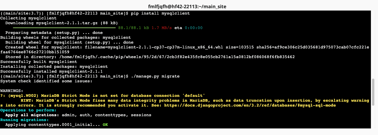 Sau đó cài thêm thư viện mysqlclient và chạy lại lệnh lưu cấu hình