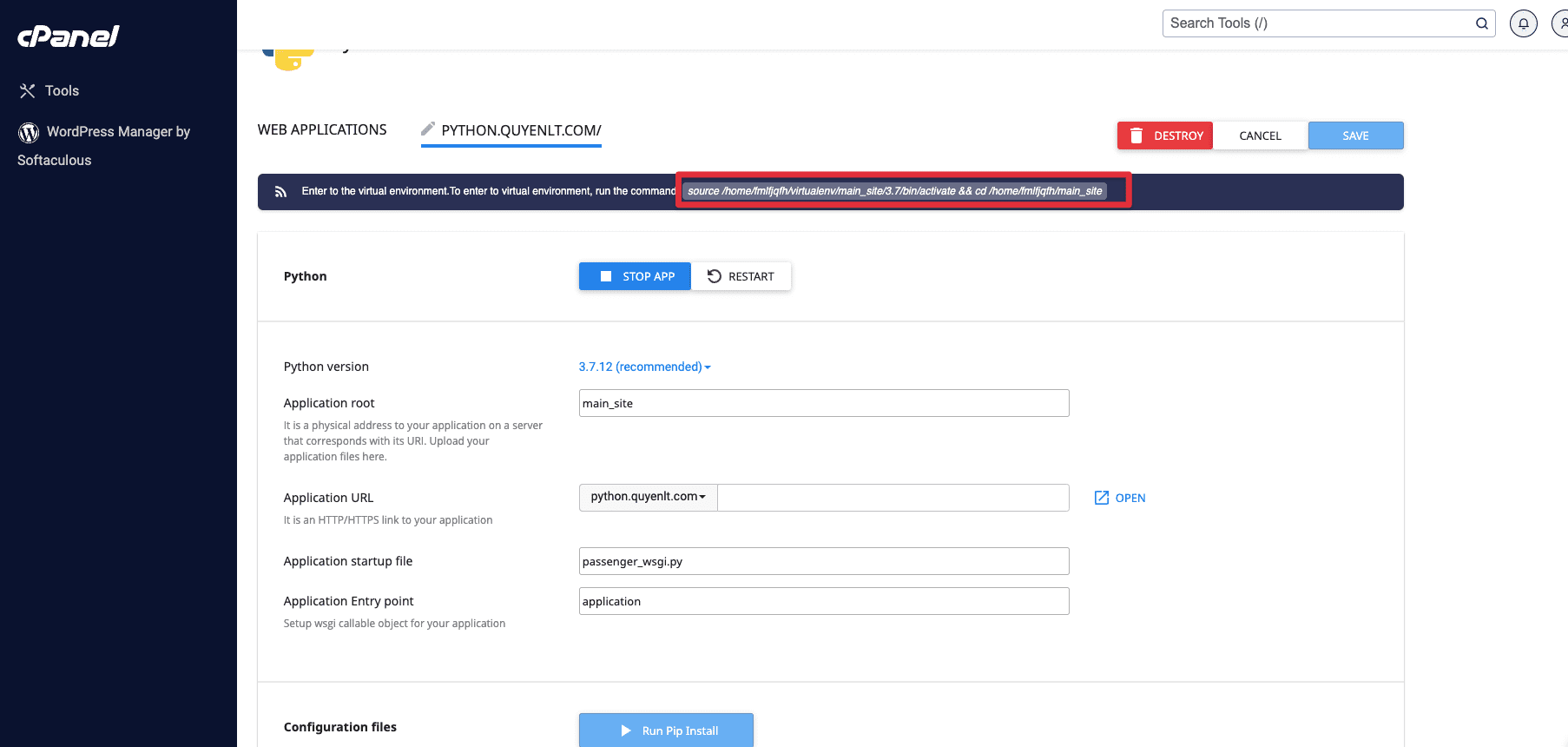 - Copy lệnh truy cập vào môi trường ảo vừa tạo cho python app và thực thi lệnh qua giao hiện ssh trên cPanel