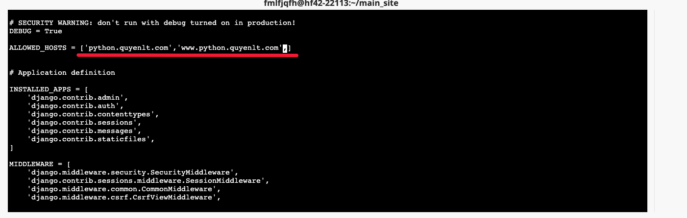- Tại dòng “ALLOWED_HOSTS” thêm vào tên domain muốn truy cập đến