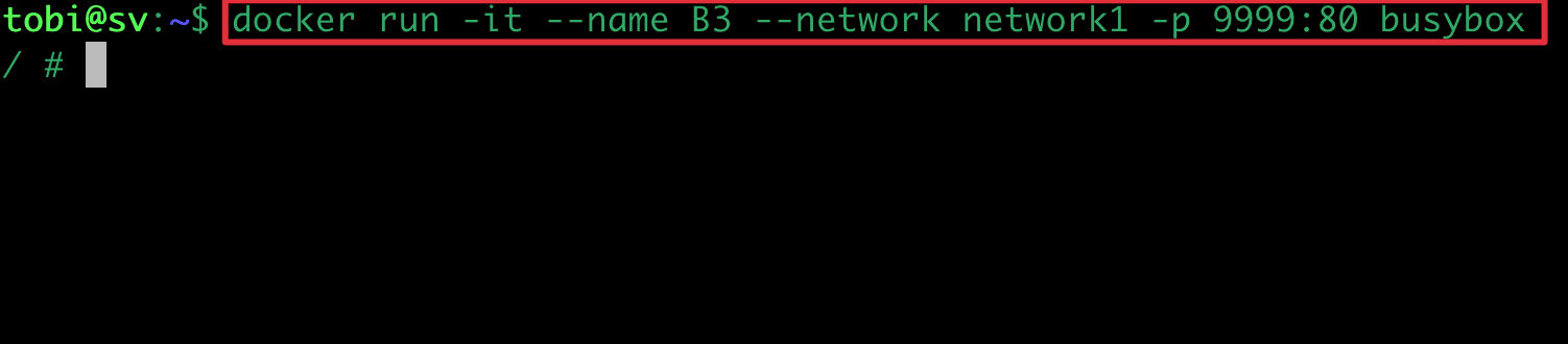 docker run -it --name B3 --network network1 -p 9999:80 busybox