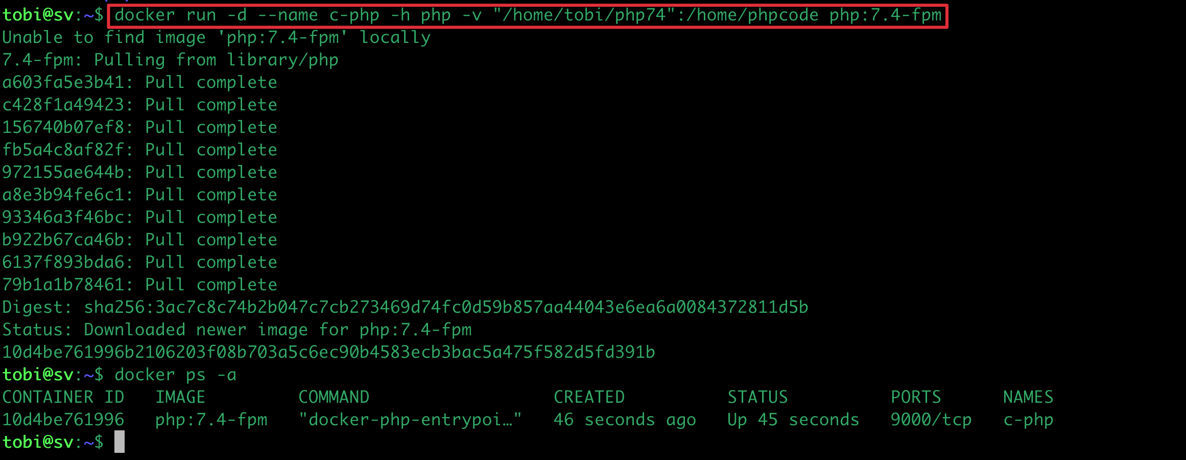 docker run -d --name c-php -h php -v "/home/tobi/php74":/home/phpcode php:7.4-fpm