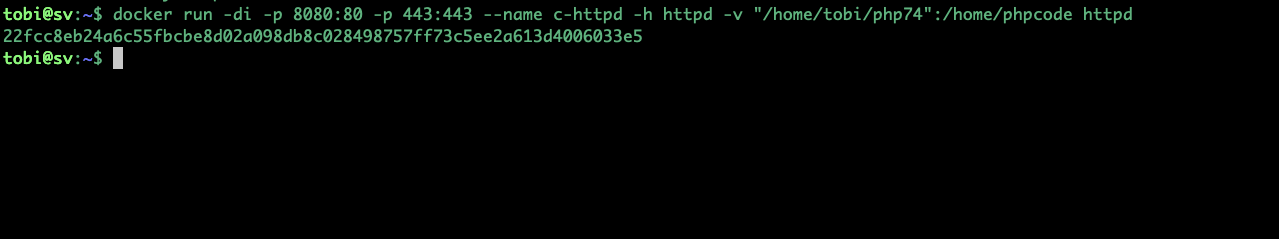 docker run -di -p 8080:80 -p 443:443 --name c-httpd -h httpd -v "/home/tobi/php74":/home/phpcode httpd