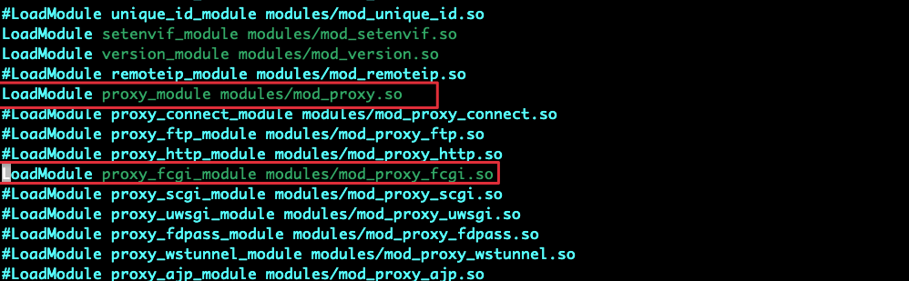 LoadModule proxy_module modules/mod_proxy.so LoadModule proxy_fcgi_module modules/mod_proxy_fcgi.so